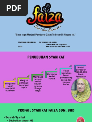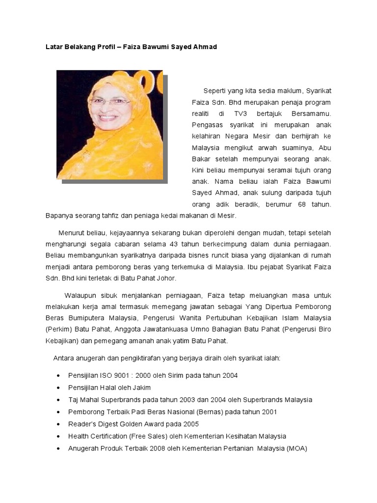 Latar belakang syarikat faiza. 11112015 31 Latar belakang Puan Faiza Bawumi Sayed Ahmad Faiza Bawumi Sayed Ahmad merupakan pemilik syarikat pemborong beras Syarikat Faiza SdnBhd dan kini beliau berusia 69 tahun. 2002 Mendapat pengiktirafan. Beralamat di PLO 442 Jalan Wawasan 16 Kawasan Industri Sri Gading 2 83000 Batu Pahat Johor.