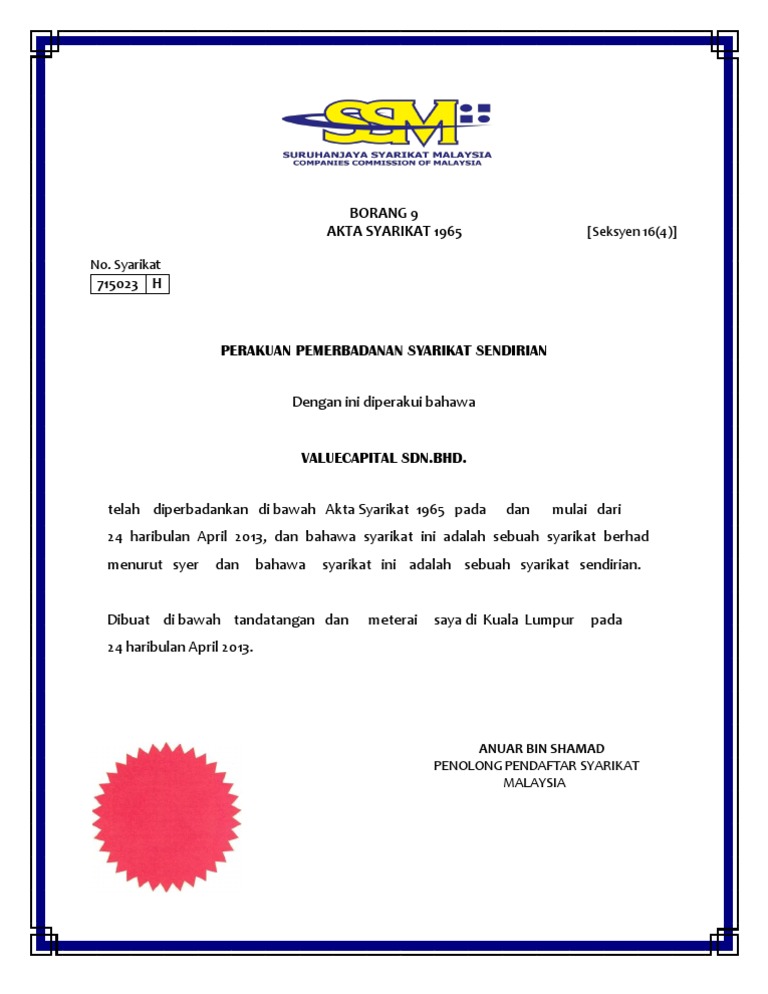 Telah diperbadankan di bawah Akta Syarikat 1965 pada dan mulai dari 11 haribulan Mac 2014 dan bahawa syarikat ini adalah sebuah syarikat berhad menurut syer dan bahawa syarikat ini adalah sebuah syarikat. B sementara itu terdapat perubahan kepada akta syarikat 2016 1 hanya seorang pengarah dan pemegang saham. MA dan pelantikan setiausaha syarikat pada ketika pemerbadanan adalah pilihan Tiada lagi pelbagai borang bagi proses pemerbadanan PEMERBADANAN SYARIKAT DALAM AKTA SYARIKAT 2016.